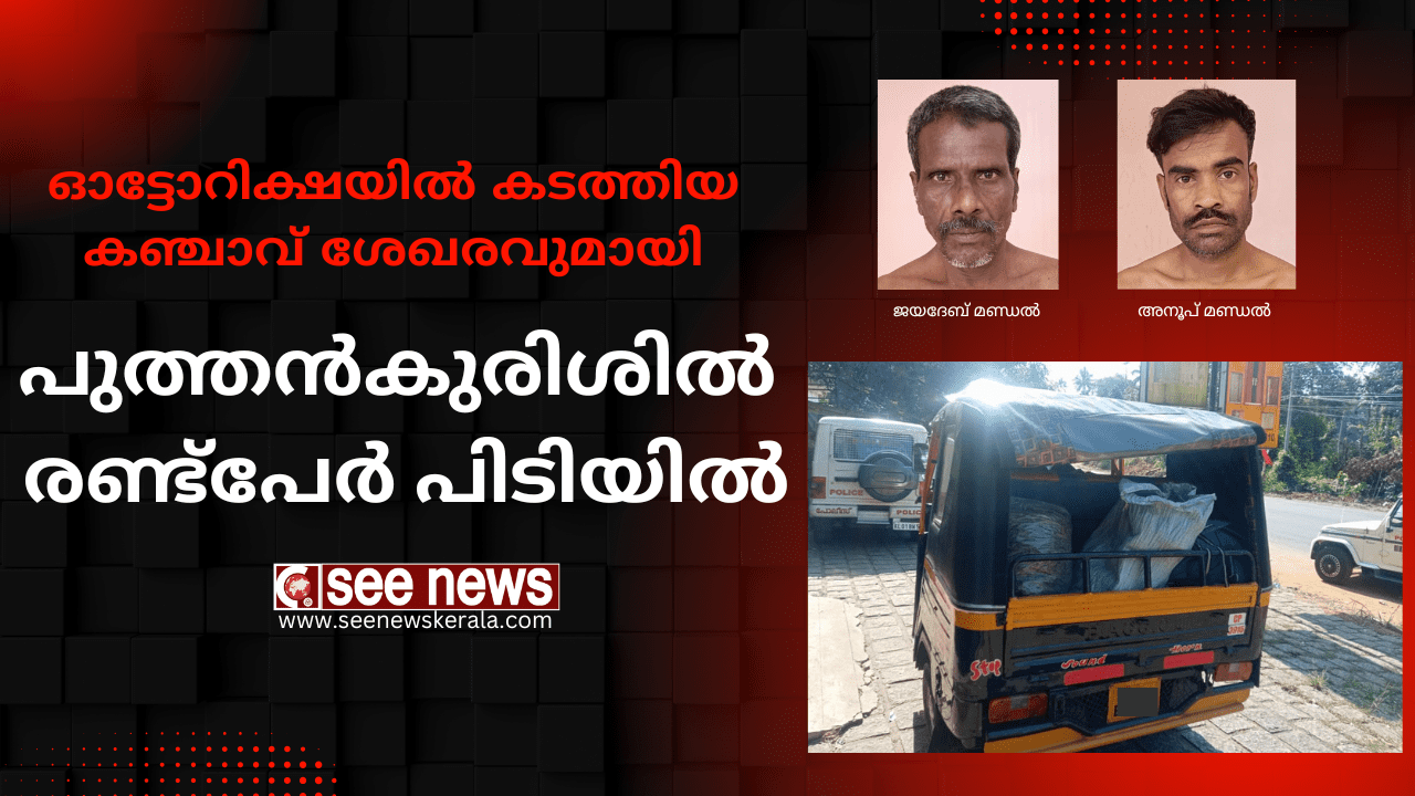 ഓട്ടോറിക്ഷയിൽ കടത്തിയ കഞ്ചാവ് ശേഖരവുമായി രണ്ട് ഇതര സംസ്ഥാന തൊഴിലാളികളെ പിടികൂടി. പശ്ചിമ ബംഗാൾ മുർഷിദാബാദ് സ്വദേശികളായ ജയദേബ് മണ്ഡൽ (57), അനൂപ് മണ്ഡൽ (38) എന്നിവരെയാണ് പുത്തൻകുരിശ് പോലീസ് അറസ്റ്റ് ചെയ്തത്.