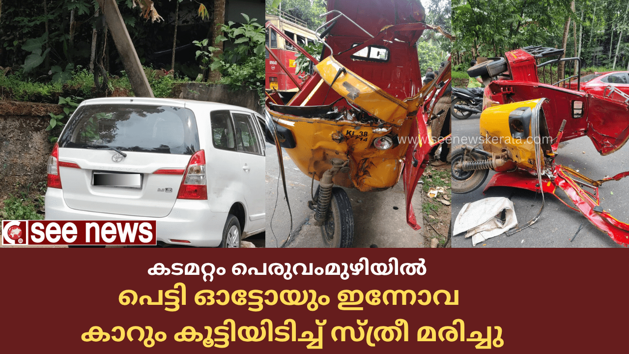 കടമറ്റം പെരുവംമുഴിയിൽ പെട്ടി ഓട്ടോയും ഇന്നോവ കാറും കൂട്ടിയിടിച്ച് തമിഴ്നാട് സ്വദേശിയായ സ്ത്രീ മരിച്ചു