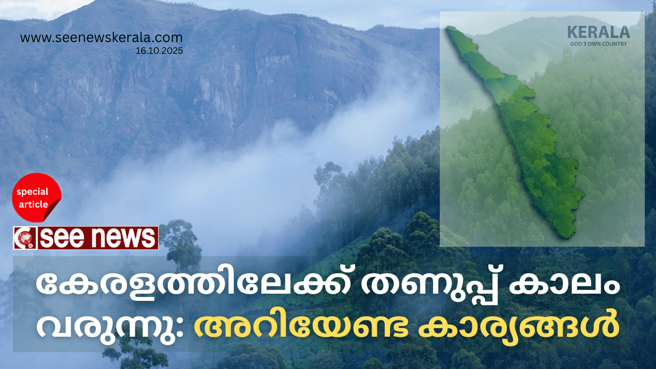 മഴയുടെ കുളിരിൽ നിന്ന് മാറി കേരളം ഇനി ശൈത്യകാലത്തെ വരവേൽക്കാൻ ഒരുങ്ങുകയാണ്. ഉത്തരേന്ത്യൻ സംസ്ഥാനങ്ങളെ അപേക്ഷിച്ച് കഠിനമായ തണുപ്പ് കേരളത്തിൽ അനുഭവപ്പെടാറില്ലെങ്കിലും മഴയുടെ പിൻവാങ്ങലോടെ തെളിഞ്ഞ അന്തരീക്ഷവും മലയോര മേഖലകളിലെ കൊടും തണുപ്പും ഈ കാലത്തിന്റെ പ്രത്യേകതയാണ്.