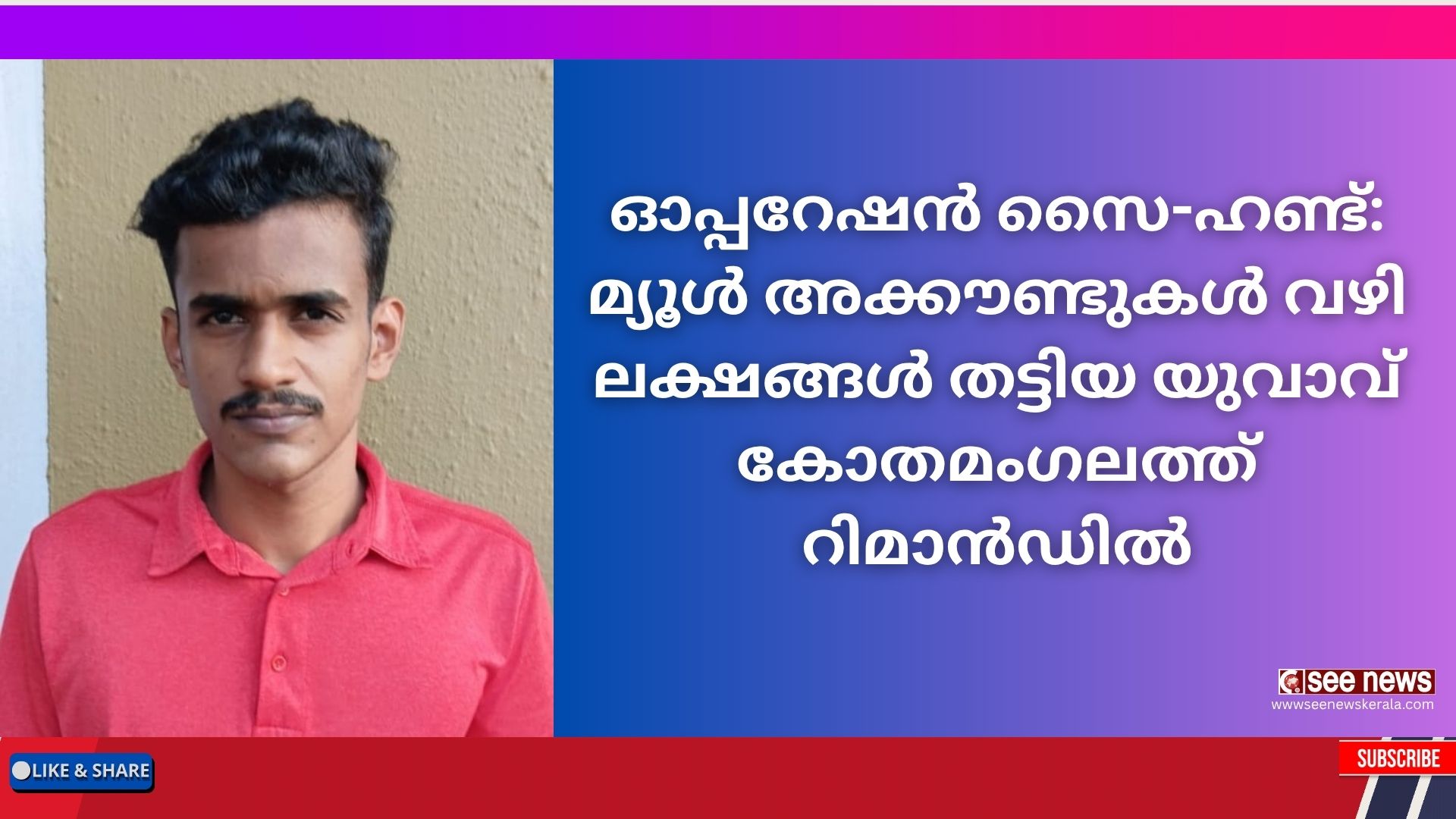 ഓപ്പറേഷൻ സൈ – ഹണ്ടിൻ്റെ ഭാഗമായി കോതമംഗലത്ത് നടത്തിയ റെയ്ഡിൽ ഒരാൾ റിമാൻ്റിൽ. കോതമംഗലം പോലീസ് അറസ്റ്റ് ചെയ്ത വാരപ്പെട്ടി ഇഞ്ചൂർ വട്ടക്കുടിയിൽ മുഹമ്മദ് യാസിൻ (22) നെയാണ് റിമാൻ്റ് ചെയ്തത്. ഇയാളുടെ അക്കൗണ്ടിലേക്ക് പല അക്കൗണ്ടുകളിൽ നിന്നും 297000 രൂപ വന്നിട്ടുണ്ട്.
