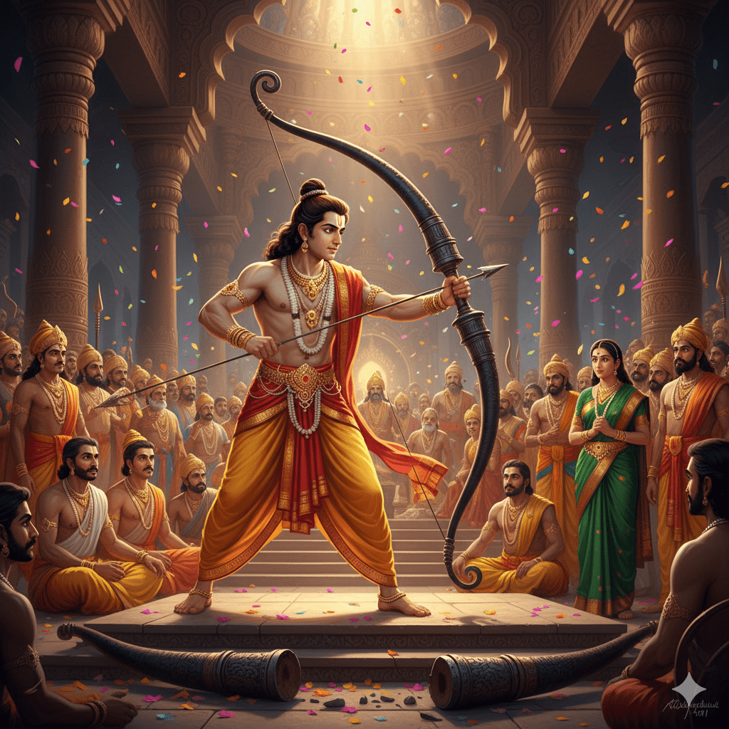 രാമൻ മുന്നോട്ട് വന്നു, അനായാസമായി ആ ദിവ്യചാപത്തിൽ കൈവെച്ചു. ഒരു ചെറുപുഞ്ചിരിയോടെ ആ ധനുസ്സ് ഉയർത്തി, അതിൽ ഞാണേറ്റാൻ ശ്രമിച്ചു… ഭൂമിയെ പിളർക്കുന്ന ഒരു ഇടിനാദം പോലെ ആ ശിവചാപം രണ്ടായി ഒടിഞ്ഞുപോയി! ⚡️
