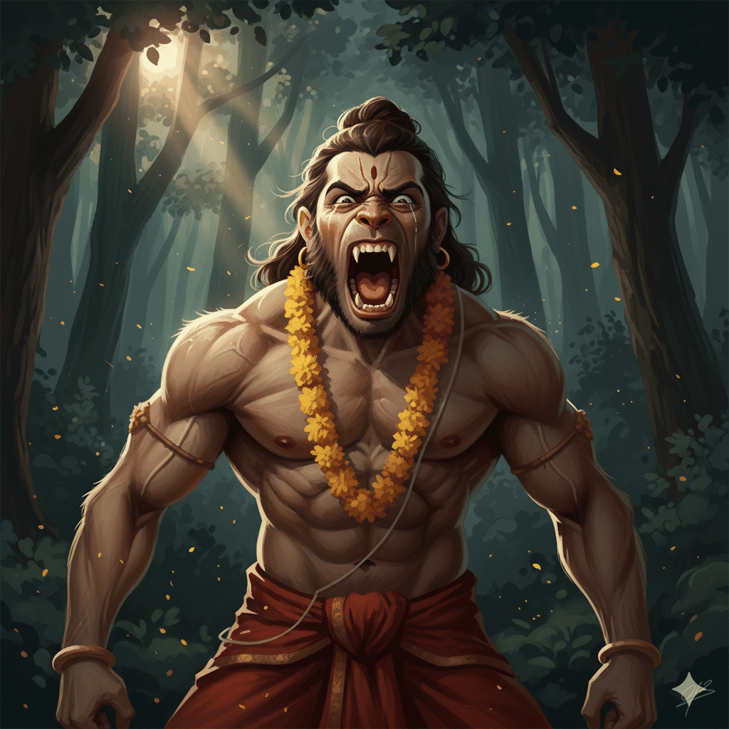 തന്റെ രാജാവിന്റെ ഭയം കണ്ടറിഞ്ഞ ഹനുമാൻ, ഉടൻതന്നെ ഒരു സന്യാസിയുടെ വേഷം ധരിച്ചു. അതീവ വിനയത്തോടെ, കൈകൂപ്പി, രാമലക്ഷ്മണന്മാരുടെ മുന്നിൽ ചെന്നുനിന്നു.