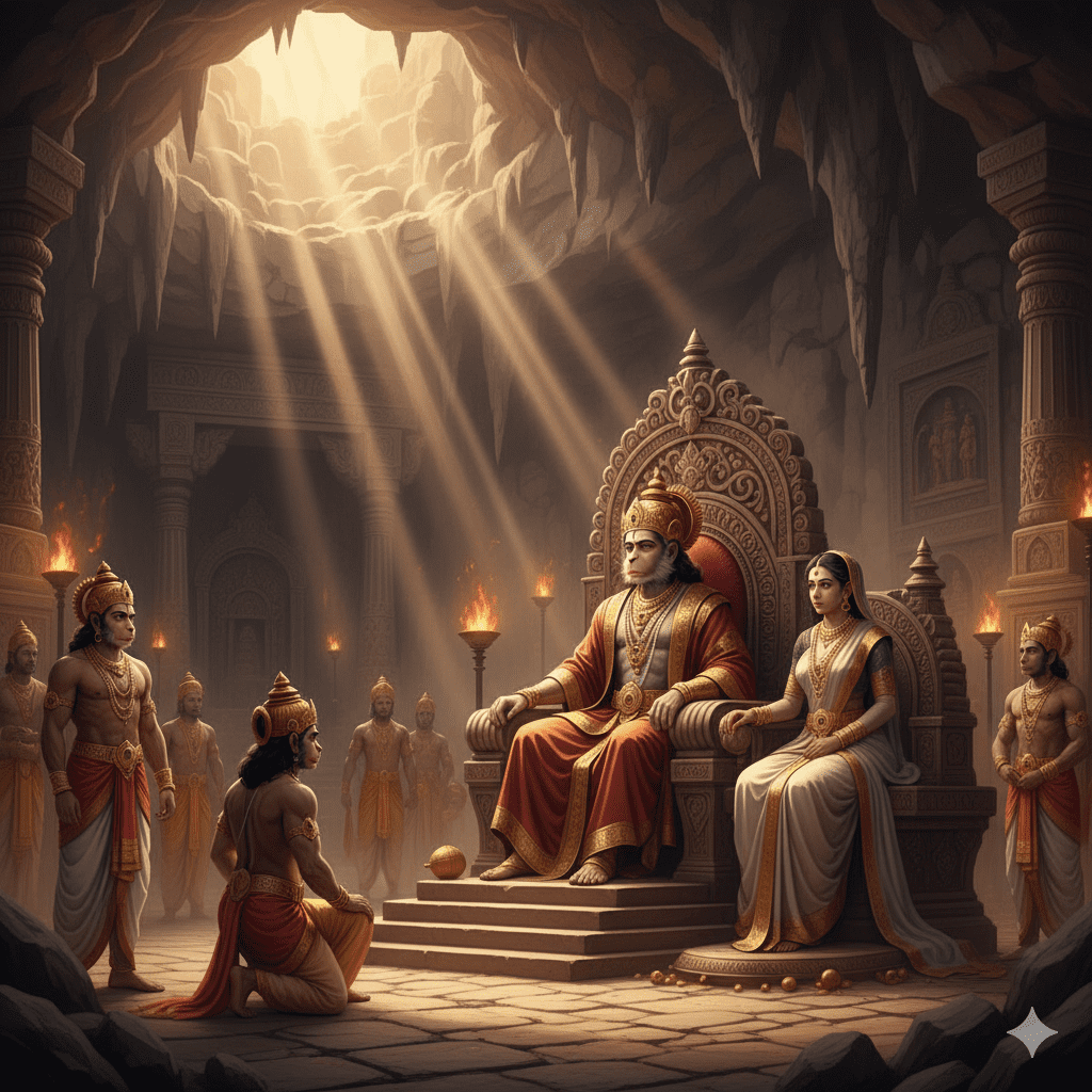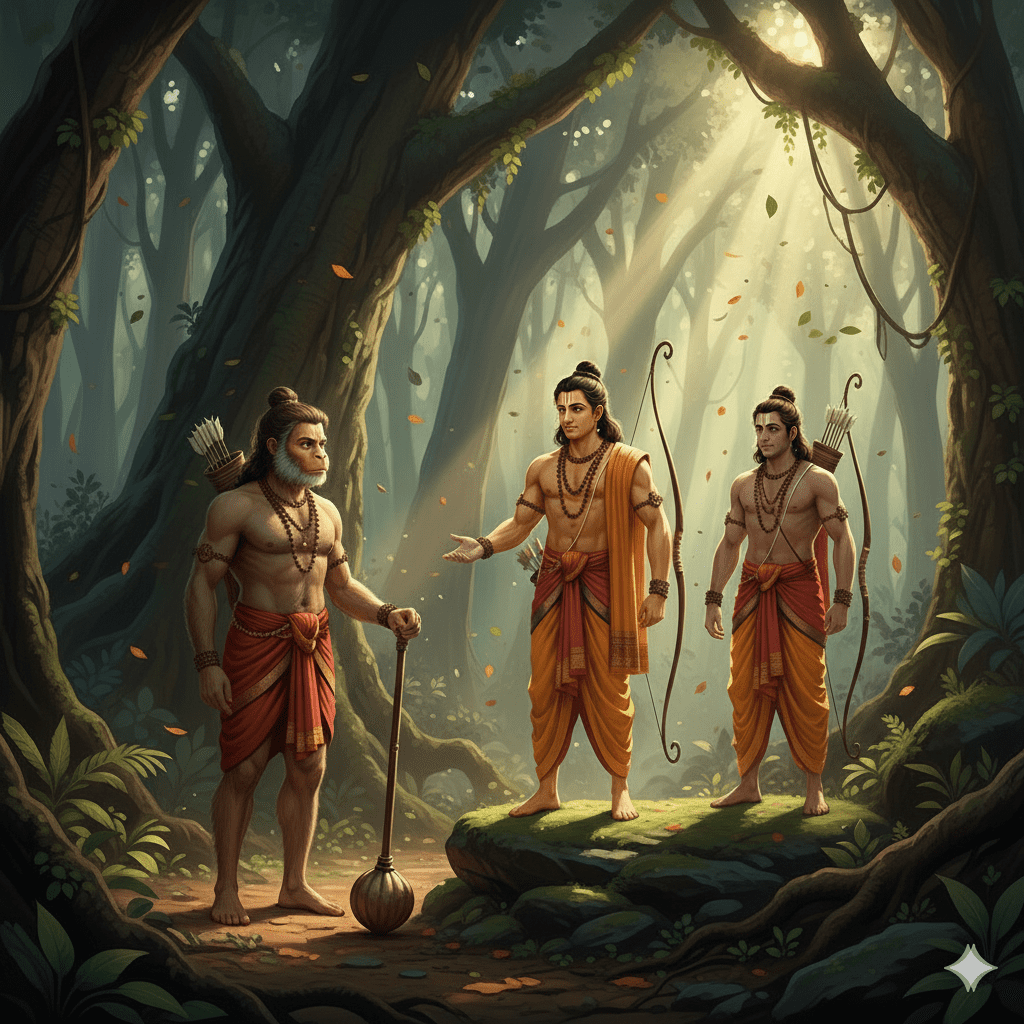 ബാലിയുടെ അമിതമായ ശക്തിയും ക്രൂരതയും അനുഭവിച്ചറിഞ്ഞ സുഗ്രീവന്, എല്ലാ അപരിചിതരെയും ഭയമായിരുന്നു. അദ്ദേഹം ഉടൻ തന്നെ വിശ്വസ്തനായ മന്ത്രി ഹനുമാനെ വിളിച്ചു. “ഹനുമാൻ, നിങ്ങൾ ഉടൻതന്നെ ഒരു സാധാരണ ഭിക്ഷാംദേഹിയുടെ രൂപം ധരിച്ച് അവരുടെ അടുക്കൽ പോകുക. അവർ ആരാണെന്നും, എന്തിനാണ് ഇവിടെ വന്നതെന്നും, അവരുടെ ഉദ്ദേശ്യമെന്താണെന്നും സൂക്ഷ്മമായി മനസ്സിലാക്കണം. അവർ ഏതെങ്കിലും വിധത്തിൽ നമ്മുക്ക് ദോഷം ചെയ്യുന്നവരാണെങ്കിൽ, രക്ഷപ്പെടാനുള്ള മാർഗ്ഗം ഉടൻ ആസൂത്രണം ചെയ്യണം.”