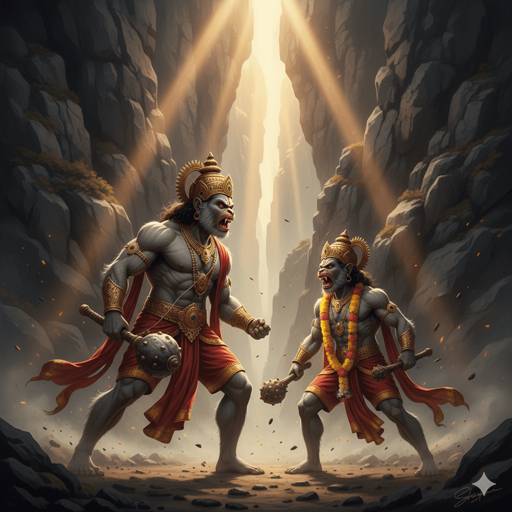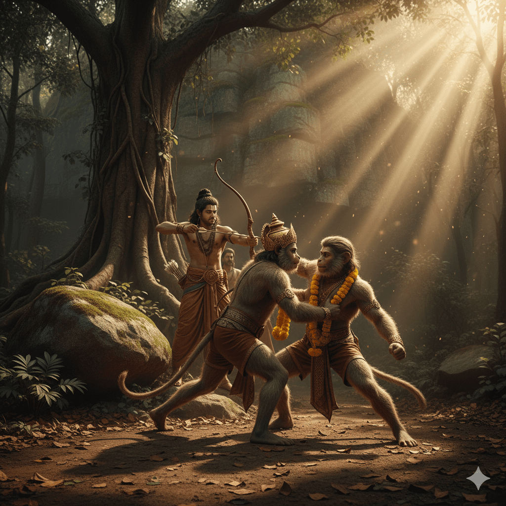 അനുജൻ പൂർണ്ണമായും പരാജയപ്പെടുന്ന ആ തീവ്രമായ നിമിഷം… രാമൻ ഒളിച്ചിരുന്നിടത്തുനിന്നും, ധർമ്മത്തിന്റെ അമ്പ്, കൊടുങ്കാറ്റ് പോലെ പാഞ്ഞു.