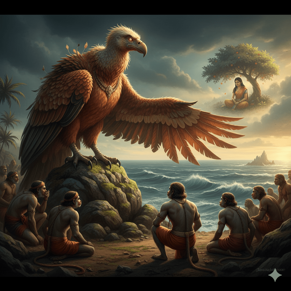 അങ്ങനെ, ദക്ഷിണ ദിശയിലേക്ക് പോയ സംഘത്തിൽ, വീരനും ബുദ്ധിമാനുമായ ഹനുമാൻ ഉണ്ടായിരുന്നു. രാമന്റെ വിരലിൽ നിന്നും ഊരിയെടുത്ത മോതിരം, സീതയെ കണ്ടാൽ നൽകാനായി സുഗ്രീവൻ ഹനുമാന്റെ കൈയ്യിൽ ഏൽപ്പിച്ചു. ആ മോതിരം, പ്രത്യാശയുടെയും വിശ്വാസത്തിന്റെയും പ്രതീകമായിരുന്നു. വാനരന്മാർ തെക്കൻ തീരത്ത് എത്തിച്ചേർന്നു. സീതയെ കണ്ടെത്താതെ നിരാശരായി കടൽത്തീരത്ത് ഇരിക്കുമ്പോൾ, അവർക്ക് മുന്നിൽ ജടായുവിന്റെ സഹോദരനായ സന്പാതി എത്തി.