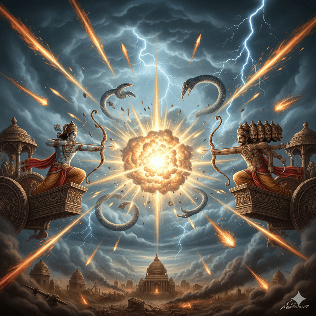 രാമനും രാവണനും തമ്മിൽ നടന്നത് വെറുമൊരു യുദ്ധമായിരുന്നില്ല, ധർമ്മവും അധർമ്മവും തമ്മിലുള്ള പോരാട്ടമായിരുന്നു. തലകൾ മുറിച്ചിട്ടും രാവണൻ മരിക്കുന്നില്ല എന്ന് കണ്ട രാമൻ്റെ അരികിൽ വിഭീഷണൻ ഓടിയെത്തി. നാഭിയിലാണ് രാവണൻ അമൃത് സൂക്ഷിച്ചിരിക്കുന്നത് എന്നും, അവിടെ അസ്ത്രം തറച്ചാൽ മാത്രമേ അവൻ മരിക്കുകയുള്ളൂ എന്നും വിഭീഷണൻ രാമനെ അറിയിച്ചു. വിഭീഷണൻ്റെ വാക്കുകൾ കേട്ട്, രാമൻ തൻ്റെ കയ്യിലെ ഏറ്റവും ശക്തമായ ആയുധമായ, ബ്രഹ്മാവ് ഉപദേശിച്ചുകൊടുത്ത ബ്രഹ്മാസ്ത്രം എടുത്ത് മന്ത്രങ്ങൾ ചൊല്ലി.