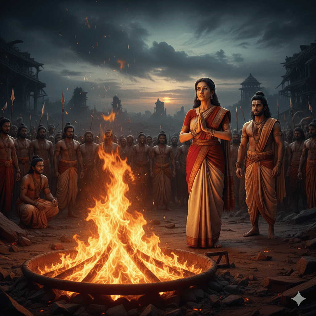 രാമന്റെ വാക്കുകൾ കേട്ട് സീത തകർന്നുപോയി. കണ്ണീരോടെ, എന്നാൽ ഉറച്ച ശബ്ദത്തിൽ അവർ രാമനോട് സംസാരിച്ചു. രാമന് തന്നെക്കുറിച്ച് ഇത്രമാത്രം സംശയമുണ്ടെങ്കിൽ, നേരത്തെ തന്നെ ഉപേക്ഷിക്കാമായിരുന്നില്ലേ എന്ന് സീത ചോദിക്കുന്നു. രാവണന്റെ പിടിയിലായിരുന്നപ്പോൾ തന്റെ ശരീരം മാത്രമാണ് അവന്റെ അധീനതയിലായത് എന്നും, തന്റെ മനസ്സ് എപ്പോഴും രാമനിൽ മാത്രം അർപ്പിച്ചിരുന്നു എന്നും സീത പറയുന്നു. തന്റെ ശാരീരികമായ അവസ്ഥയേക്കാൾ, തന്റെ ഹൃദയവിശുദ്ധിയാണ് പരിഗണിക്കേണ്ടതെന്ന് സീത പറയുന്നു. രാമനെ തൃപ്തിപ്പെടുത്താനായി ഇനി തനിക്ക് ഒരു വഴിയേ ഉള്ളൂ എന്ന് മനസ്സിലാക്കിയ സീത, സഹോദരനായ ലക്ഷ്മണനോട് അഗ്നി കൂട്ടി തീ കൂട്ടാൻ ആവശ്യപ്പെടുന്നു. സീതയുടെ ആജ്ഞ കേട്ട് ലക്ഷ്മണൻ ദുഃഖത്തോടെ അഗ്നികുണ്ഡം ഒരുക്കി.
