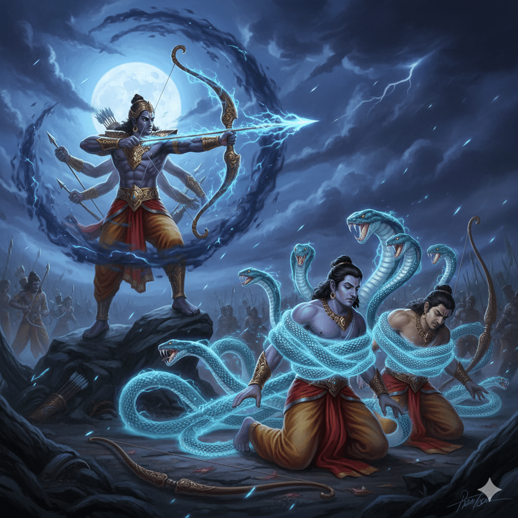 യുദ്ധത്തിൻ്റെ ആദ്യ ഘട്ടത്തിൽ ഇന്ദ്രജിത്ത് അദൃശ്യനായി നിന്നാണ് രാമൻ്റെയും ലക്ഷ്മണൻ്റെയും നേർക്ക് അസ്ത്രങ്ങൾ അയച്ചത്. ആകാശത്ത് മറഞ്ഞുനിന്ന് ആക്രമിക്കുന്നതുകൊണ്ട് അവനെ നേരിട്ട് എതിർക്കാൻ രാമനും ലക്ഷ്മണനും കഴിഞ്ഞില്ല. ഈ അവസരത്തിലാണ് ഇന്ദ്രജിത്ത് ദേവന്മാരെപ്പോലും ബന്ധിക്കാൻ കഴിവുള്ള സർപ്പാസ്ത്രം പ്രയോഗിച്ചത്.