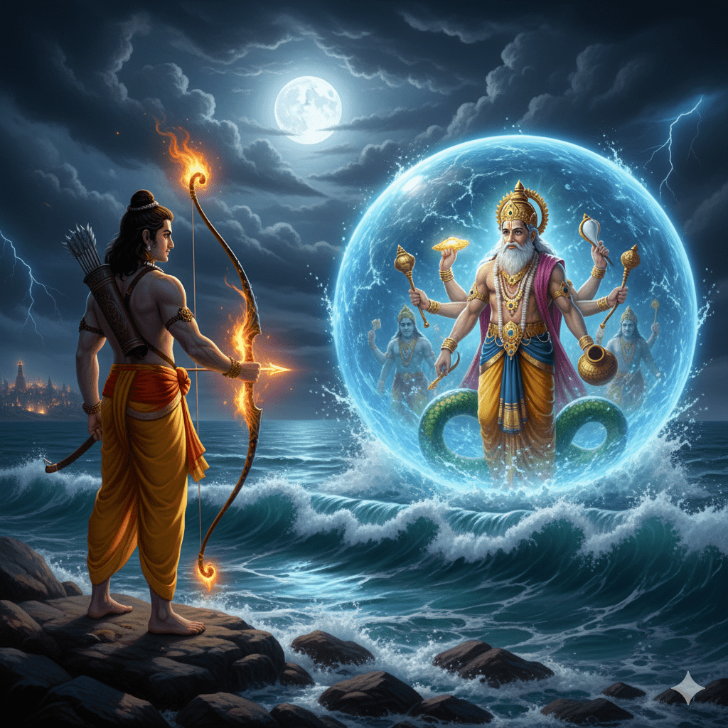 സീതാദേവിയെ വീണ്ടെടുക്കുന്നതിനായി ലക്ഷ്മണൻ, സുഗ്രീവൻ, ഹനുമാൻ തുടങ്ങിയവരോടൊപ്പം വാനരസേനയും രാമനും ദക്ഷിണസമുദ്രത്തിൻ്റെ തീരത്തെത്തി. മുന്നിൽ, വൻകരയെയും ലങ്കയെയും വേർതിരിക്കുന്ന ആഴമേറിയ കടൽ. ആദ്യം, രാമൻ സമുദ്രദേവനായ വരുണൻ പ്രത്യക്ഷപ്പെട്ട് വഴി തരണമെന്ന് ആവശ്യപ്പെട്ട് മൂന്ന് ദിവസത്തേക്ക് ദർഭപ്പുല്ലിൽ ശയിച്ച് തപസ്സനുഷ്ഠിച്ചു. എന്നാൽ, വരുണൻ പ്രത്യക്ഷനാകാത്തതിൽ കോപം പൂണ്ട രാമൻ, സമുദ്രം വറ്റിച്ചുകളയുവാനായി തൻ്റെ കയ്യിലെ ശക്തമായ അസ്ത്രം എടുത്ത് ഭീഷണിപ്പെടുത്തി. ഈ സമയത്താണ് വരുണദേവൻ ഭയപ്പെട്ട് രാമൻ്റെ മുന്നിൽ പ്രത്യക്ഷപ്പെട്ടത്.