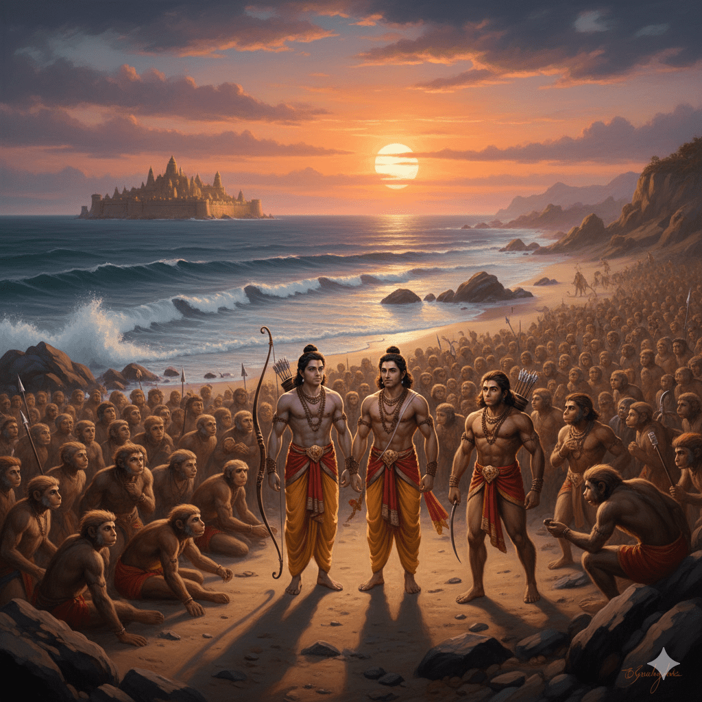 കിഷ്കിന്ധയിൽ നിന്ന് സീതയെ തേടി പുറപ്പെട്ട വാനരപ്പട, അലകടലിൻ്റെ തീരത്ത് എത്തിച്ചേർന്നു. മുന്നിൽ ആഴമേറിയ സമുദ്രം. അക്കരെ, രാവണൻ്റെ സ്വർണ്ണലങ്ക! ലക്ഷ്മണൻ്റെ ആജ്ഞ പ്രകാരം, വാഴ്‍ച്ചയിൽ നിന്ന് ഭ്രഷ്ടനാക്കപ്പെട്ട വിഭീഷണനെ രാമൻ കൈക്കൊണ്ടത് ധർമ്മത്തിൻ്റെ ആദ്യവിജയമായി.